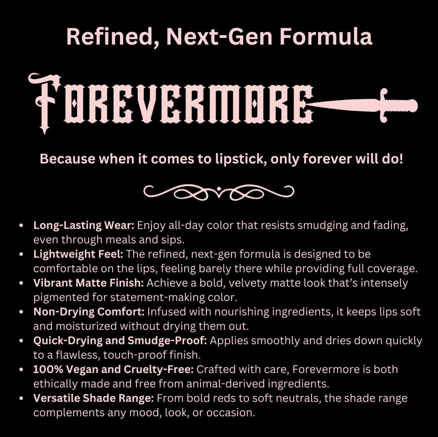 Introducing Forevermore, the liquid matte lipstick line that endures as long as your passion. With its bold, velvety matte finish, Forevermore offers intense color payoff that stays put, giving you all-day wear without touch-ups. Made for those who love color that lasts, each shade is crafted with a lightweight, non-drying formula that feels soft on the lips. Plus, as always, Forevermore is 100% cruelty-free and vegan, aligning with Medusa’s Makeup's commitment to beauty that’s both fierce and compassionate. Embrace the power of a look that lingers—Forevermore.