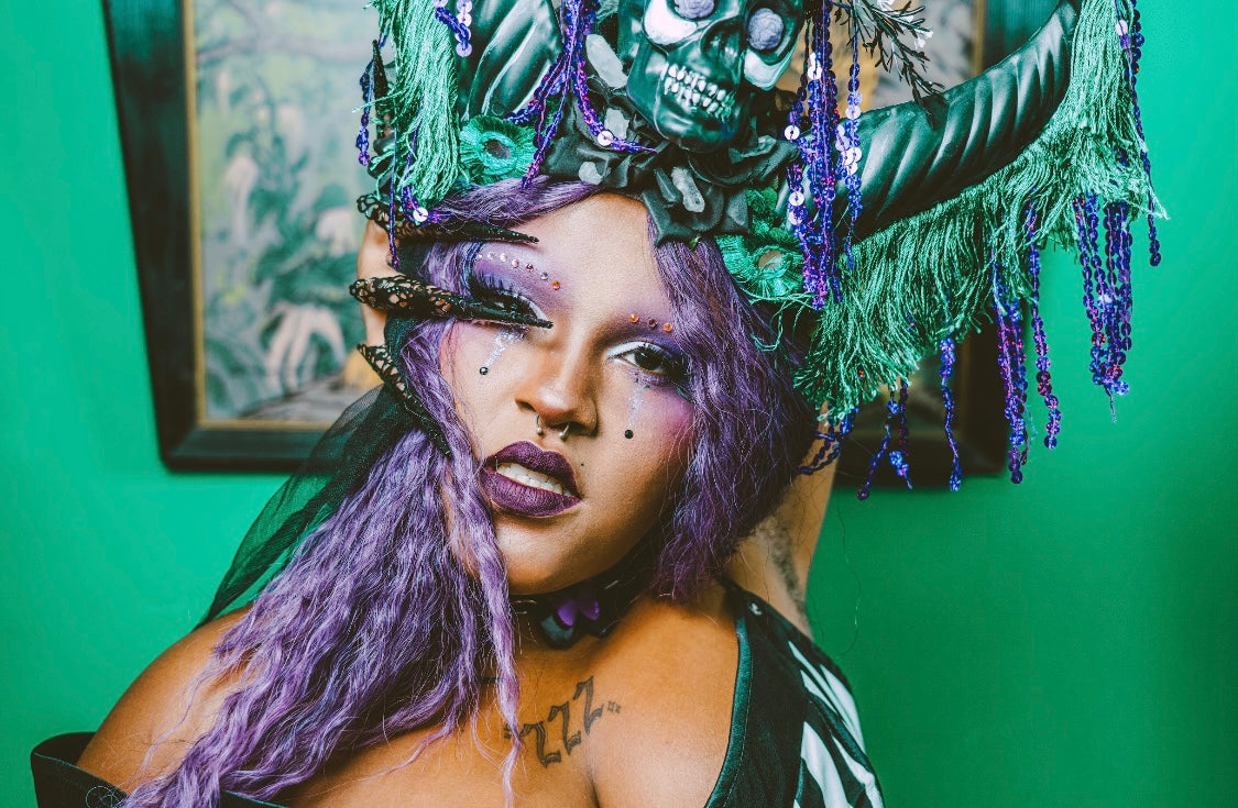 Painted skull, fringed horns, and feather come together in this witchy handmade headdress. Created in our ATX studio.