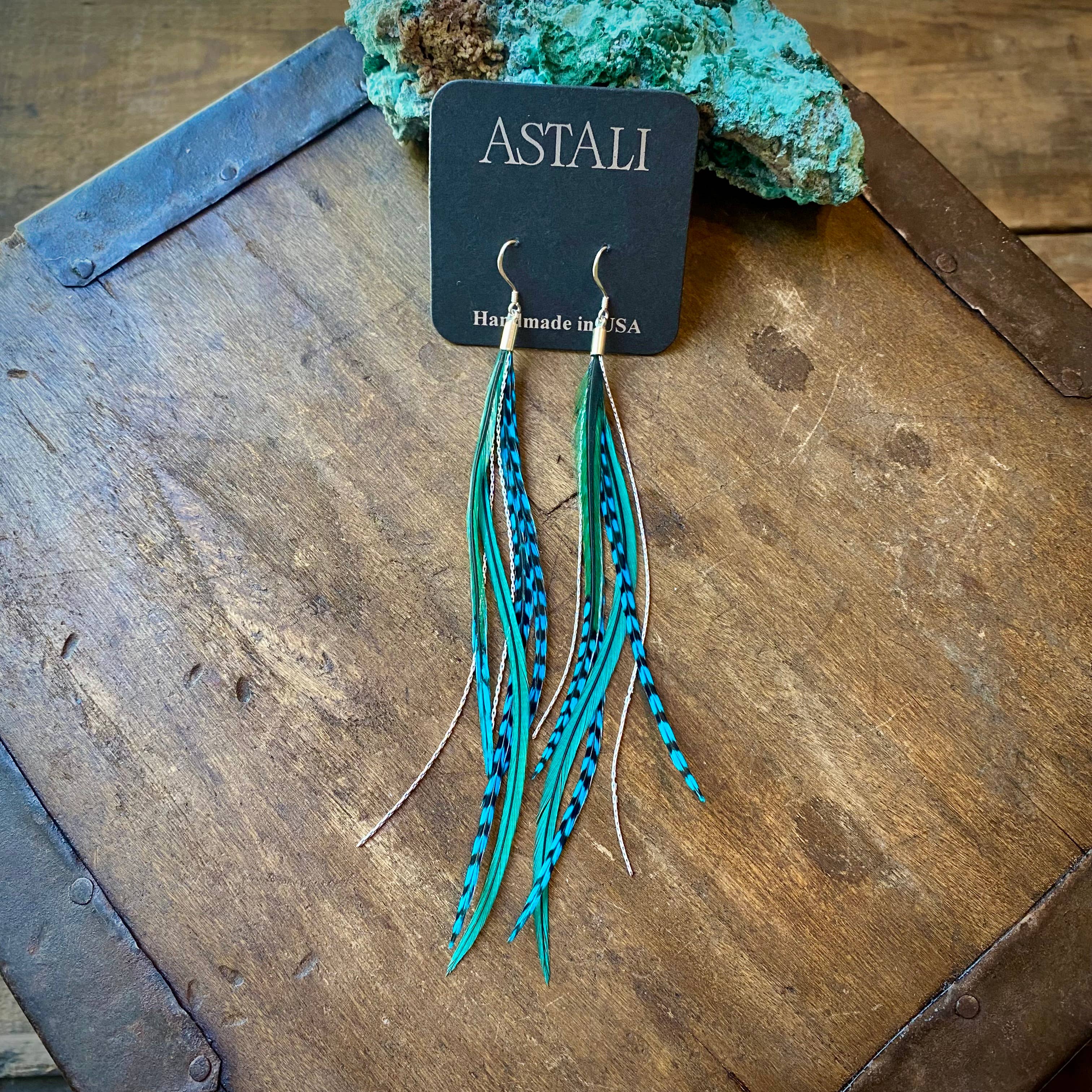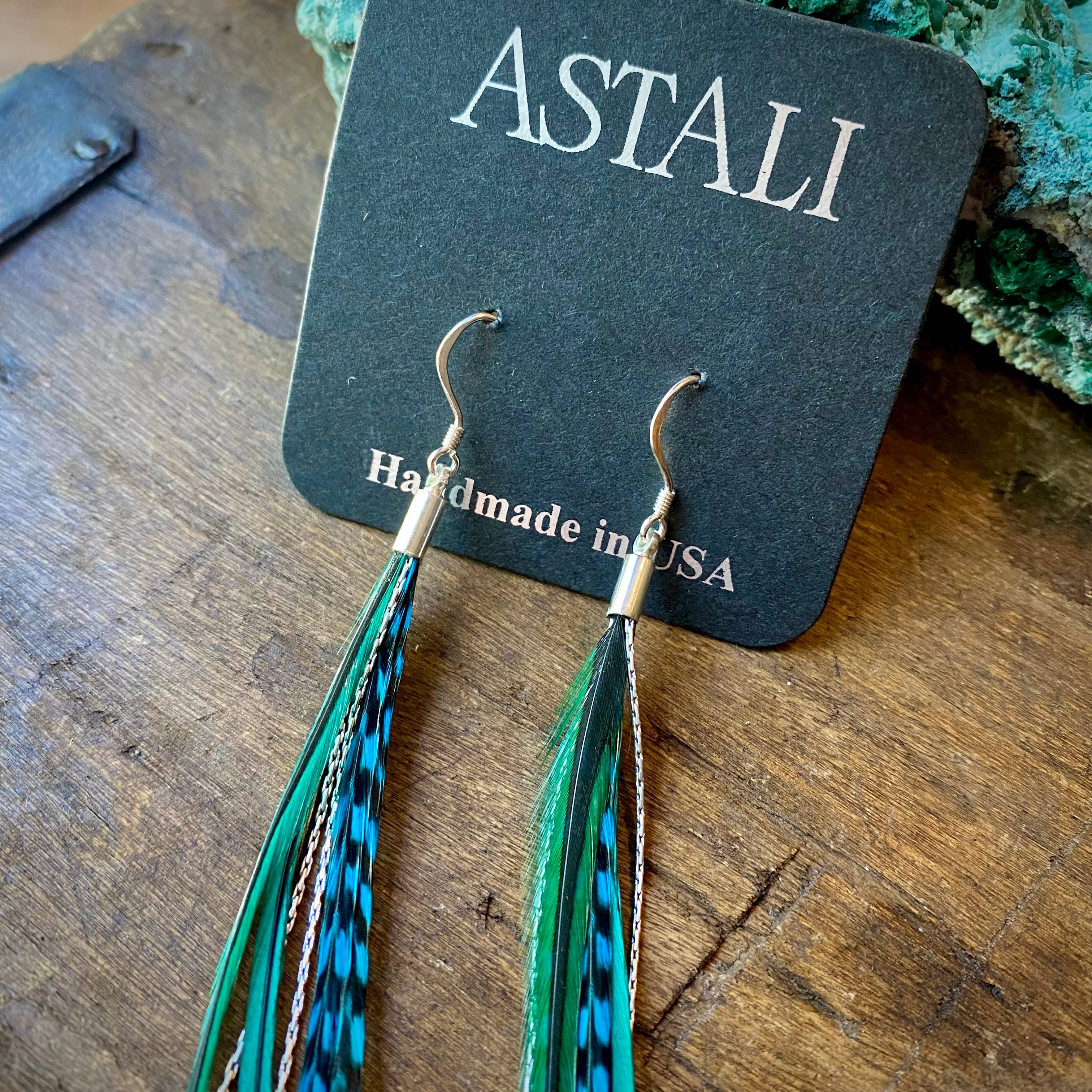 These delicate earrings are incredibly soft to the touch. Rhodium-plated chains peek out between the feathers to add texture and sparkle. Earwires are Sterling Silver Length ranges from 5" to 6" total.