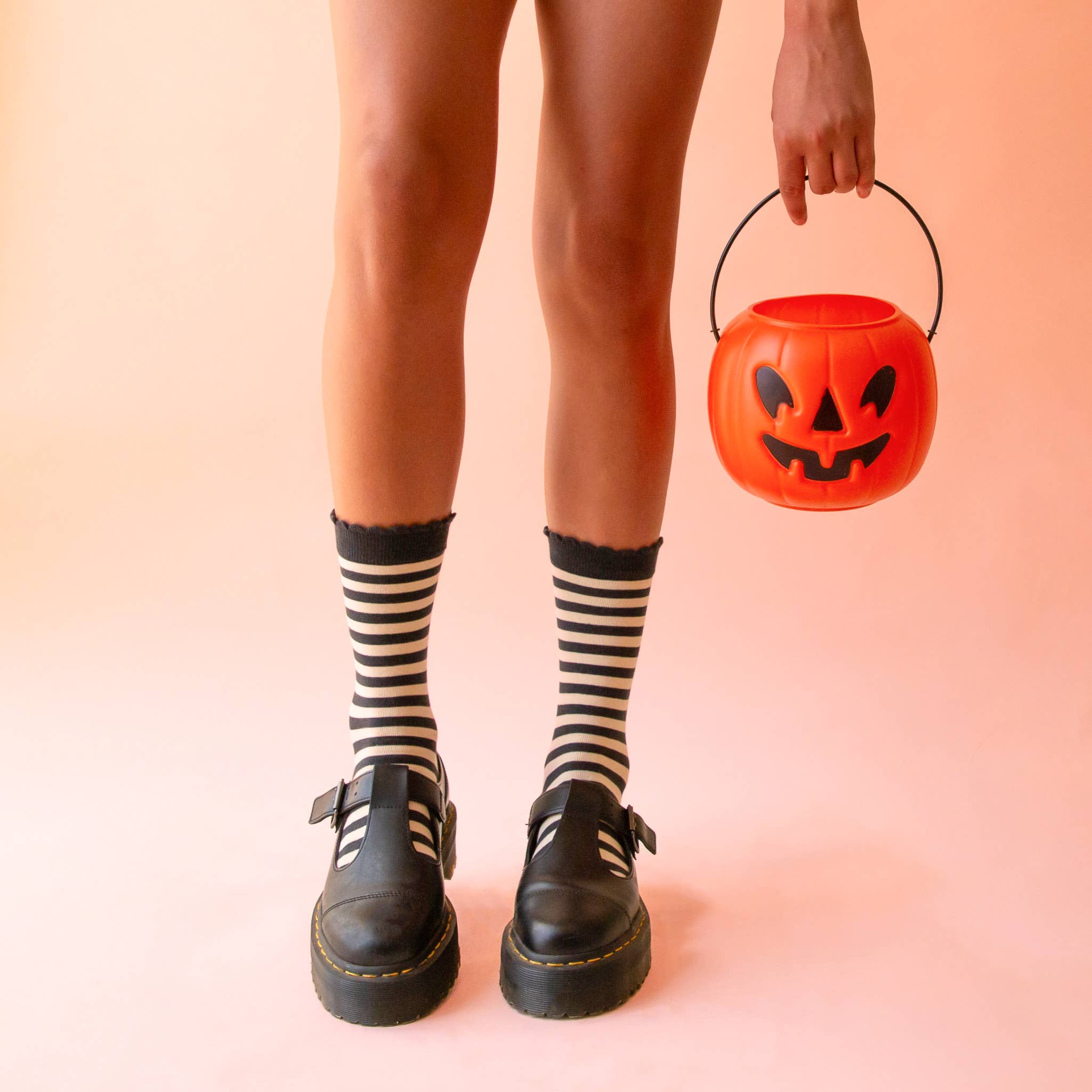 Step into spooky fun with these Black Striped Crew Socks, perfect for Halloween vibes. Featuring playful scalloped edges, they add a quirky twist to your outfit while keeping your feet cozy all day. Whether you're trick-or-treating or just embracing the season, these socks bring a festive touch with a comfortable fit.